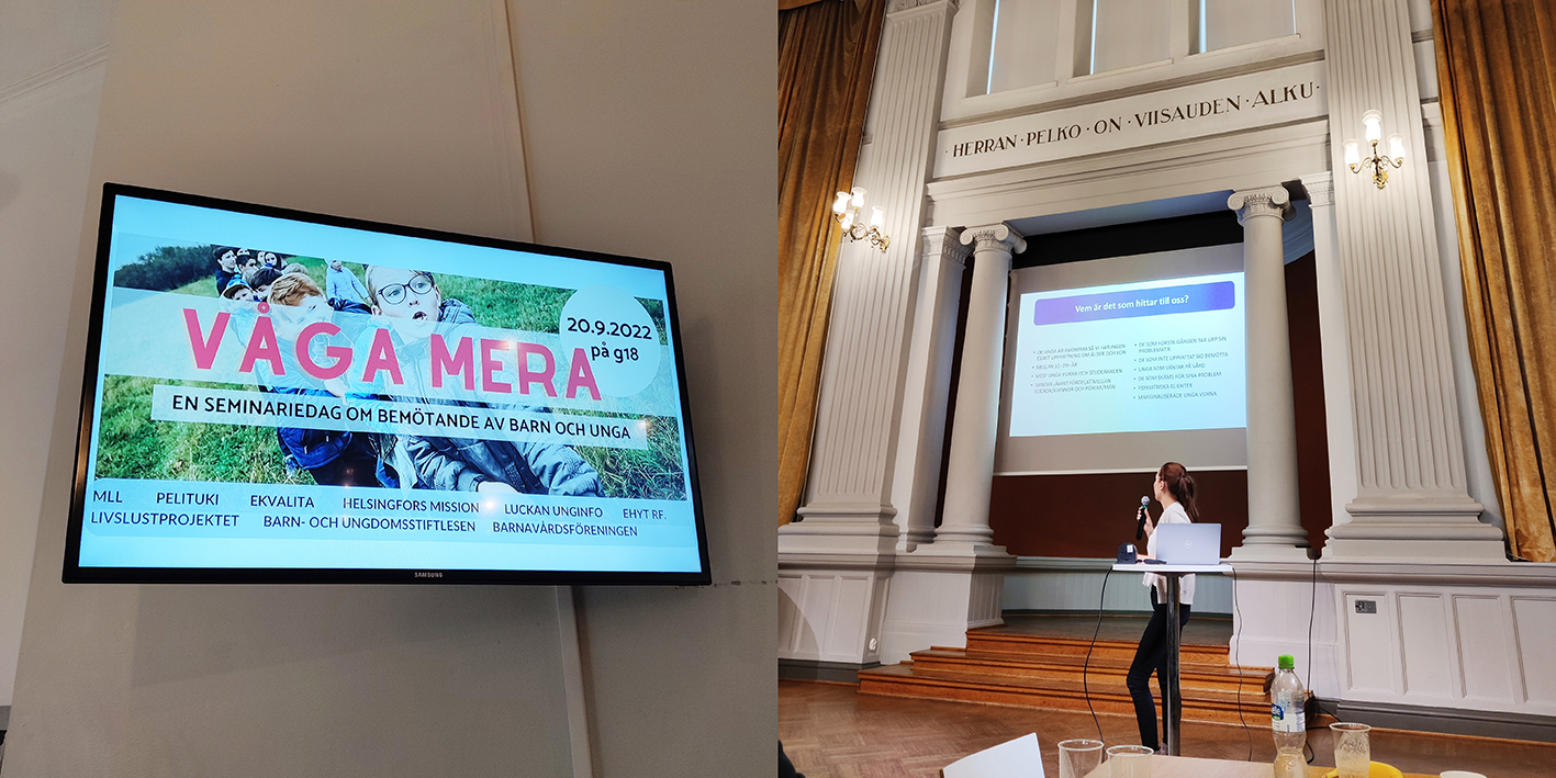 Tillsammans med Svenska skolsamarbetsnätverket ordnade vi den 20 september en seminariedag kallad Våga mera, riktad till professionella som jobbar med barn och unga. Under dagen föreläste bl.a. vår egen psykolog Helena Godenhjelm om digitalt bemötande av unga. Deltagarna kunde även ta del av andra intressanta föreläsningar om bl.a vuxnas bemötande av unga med ätstörningar, problematiskt spelande samt ensamhet.